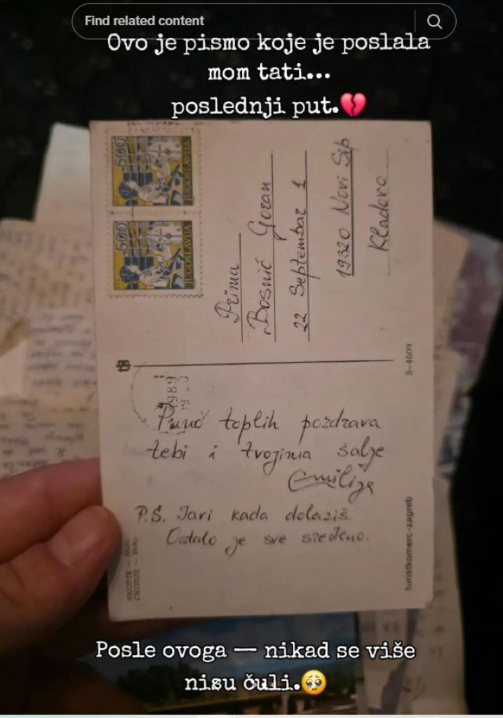 Druga fotografija nosi najviše emocija — požutelo pismo. Emilijin rukopis, nežan i uredan, kao da još miriše na neka stara vremena. A na dnu, u post scriptumu, rečenica koja danas para srce:
