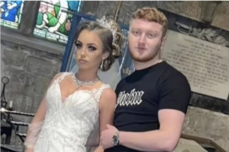 Dok je mladoženja u uskoj crnoj majici ponosno šetao do oltarai, njegova buduća supruga, šesnaestogodišnja Ketrin, odlučila se tog dana za veliku belu venčanicu koja naglašava struk i ima čipkasti vez.