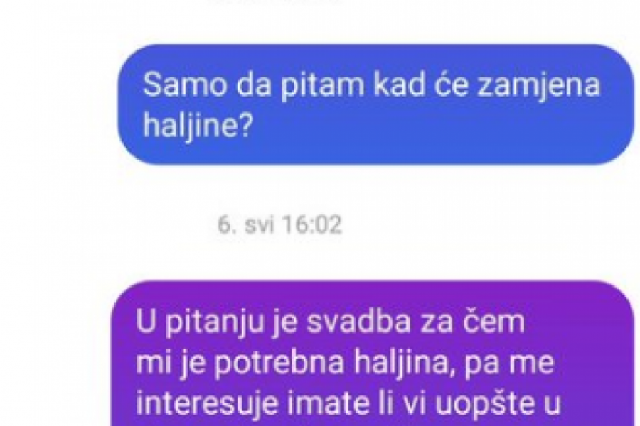 Kao što vidimo iz priloženog, nisu bili zainteresovani da izvrše zamenu haljine, a interesantno je da nisu čak ni pokušali da se opravdaju, već su samo prekinuli komunikaciju.