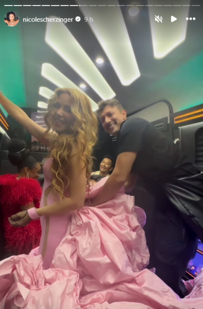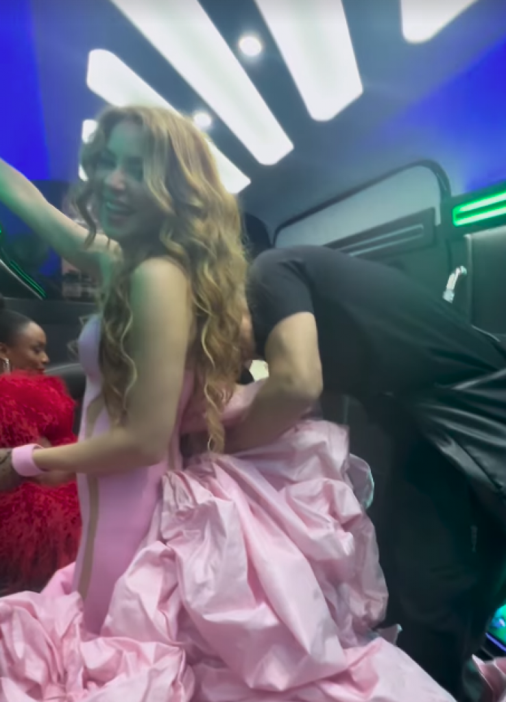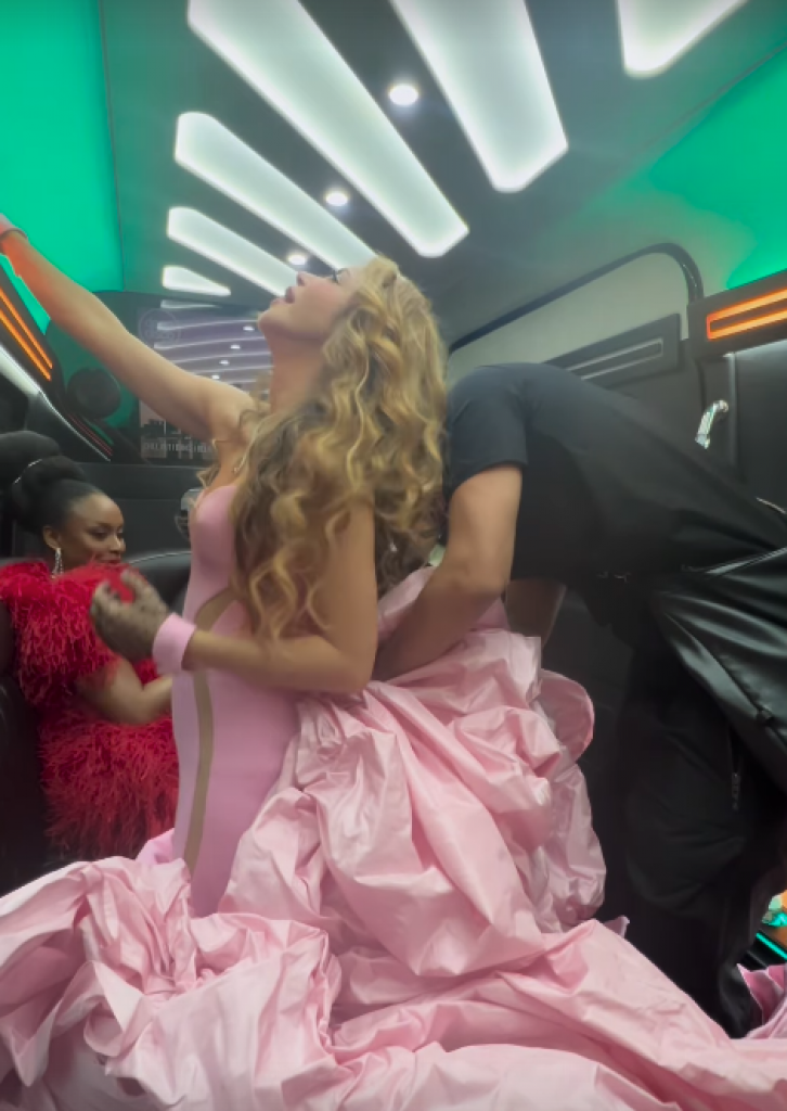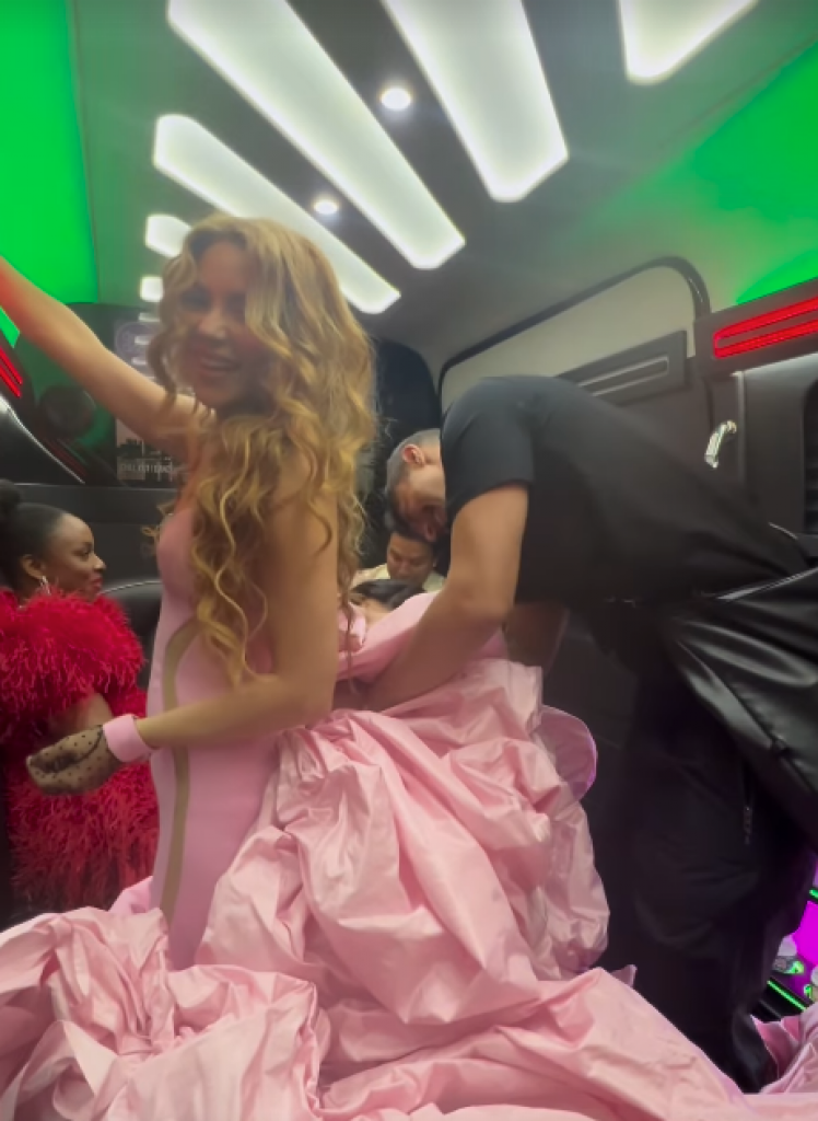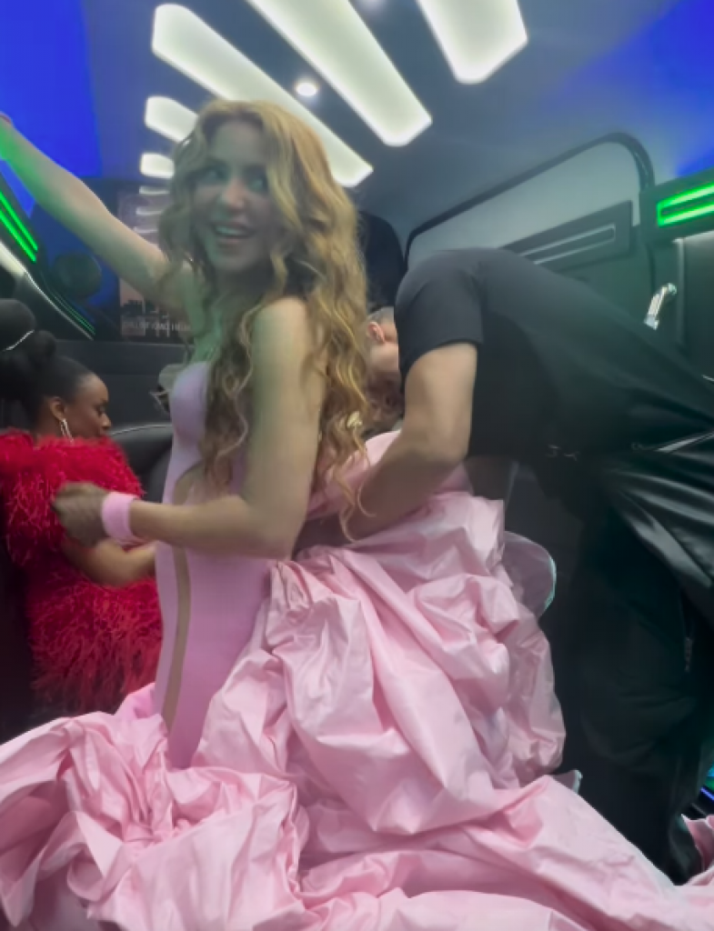 Šercinger (46) je pre njihovog dolaska podelila snimak na svom Instagramu iz limuzine, u kom se vide ona, Šakira i još nekoliko poznatih ličnosti na putu ka Met Gali, dok pevačicu u tom trenutku bukvalno ušivaju u njenu svetloružičastu haljinu.