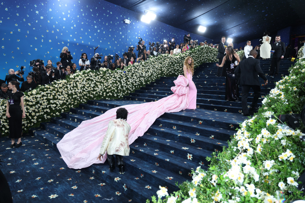 Šakirina roze haljina na gala večeri, tematski usmerena na „Superfine: Tailoring Black Style“, imala je izrezane detalje na prednjem i zadnjem delu koji su isticali njenu figuru, kao i obiman, nabreženi šlep koji je lepršao daleko iza nje. (Verovatno je jedini šlep koji je mogao da joj parira bio onaj koji je nosila Dajana Ros, dug 18 stopa, ukrašen perlama.)