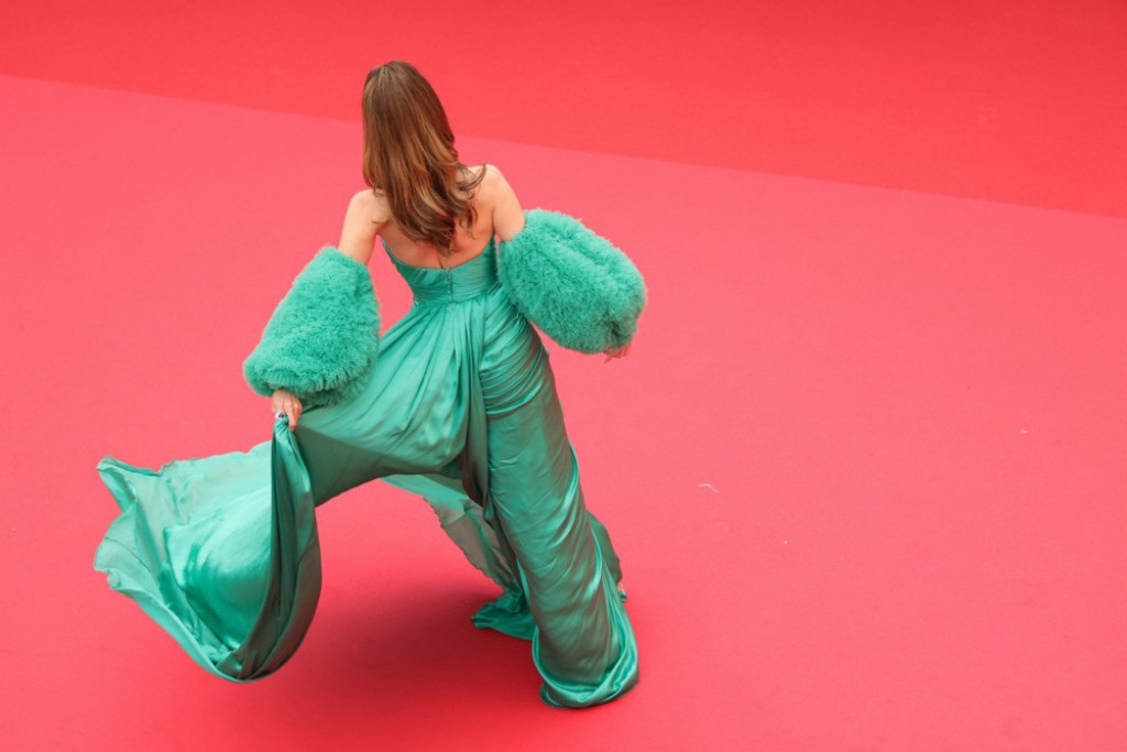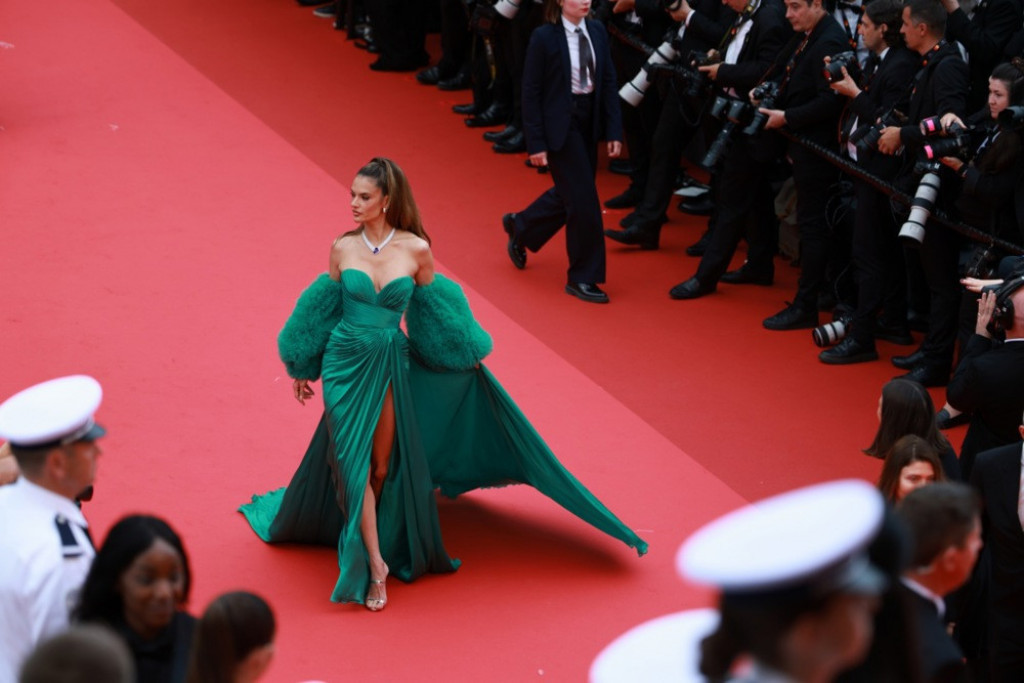 Alesandra Ambrozio je ovim stajlingom uspešno spojila se**epil i sofisticiranost, u duhu glamuroznog 78. Filmskog festivala u Kanu. Tirkizna boja je istakla njen preplanuli ten, dok su detalji poput visokog šlica i krznenih rukava dodali dozu drame i luksuza.