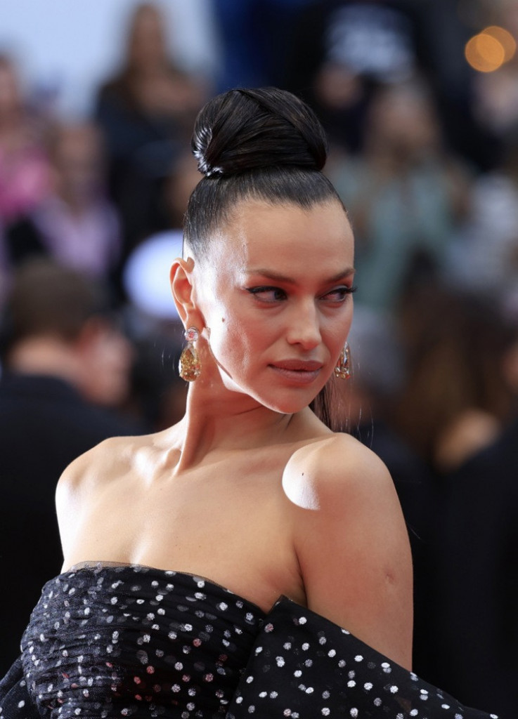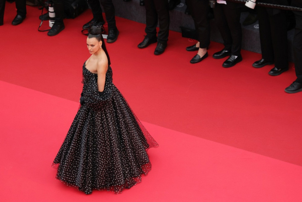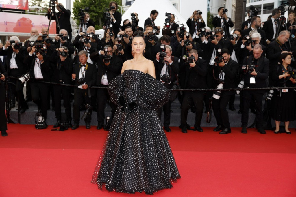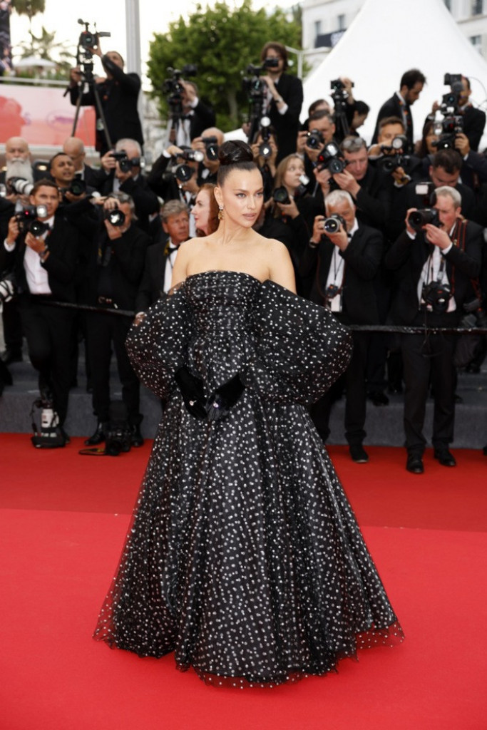 Irina Šajk je na crvenom tepihu festivala nosila elegantnu crno-belu haljinu sa tačkicama iz kolekcije Armani Privé. Haljina je imala plisiranu suknju, balon rukave i korset bez bretela, diskretno otkrivajući ramena. Ovaj izbor predstavlja značajan zaokret u odnosu na njene prethodne, provokativnije izglede na istom događaju, usklađujući se s novim pravilima festivala.