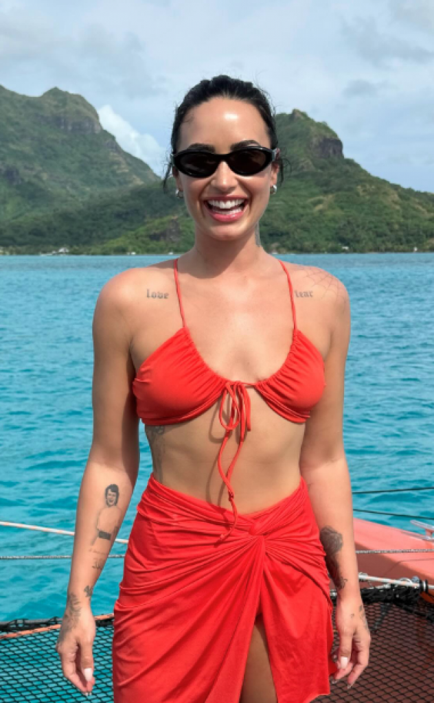 Demi Lovato je na prvoj fotografiji nosila svetlo narandžasti troslojni kupaći kostim, koji se sastojao od gornjeg dela u obliku trougla, donjeg dela visokog struka sa otkrivenim zadnjim delom i odgovarajuće pareo marame.