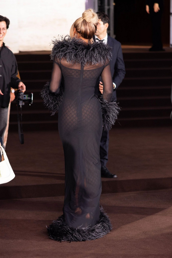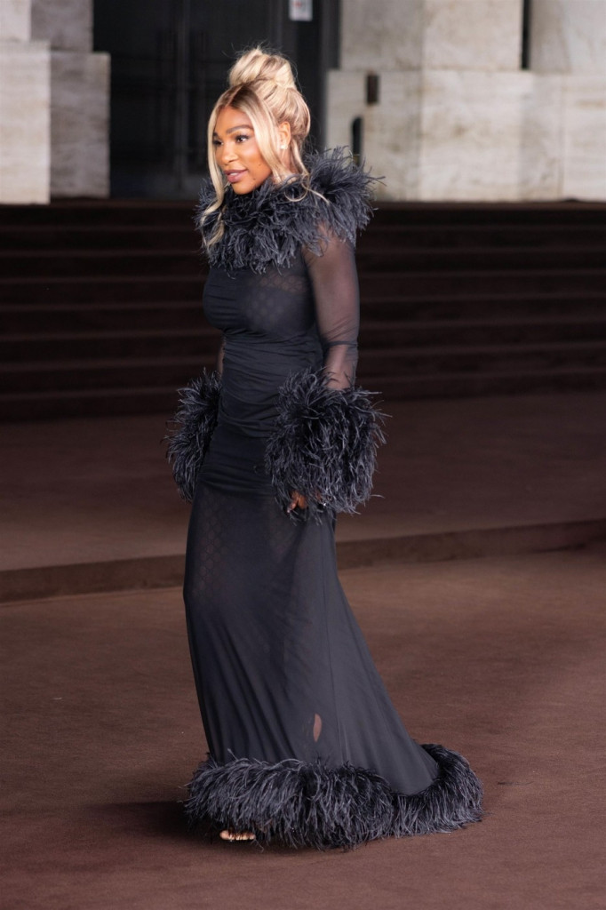 Teniska legenda izgledala je buralno u crnoj haljini dugih rukava, ukrašenoj perjem na ramenima, rukavima i ivici. Haljina je bila blago providna, ističući prepoznatljiv Gucci monogram. Njena plava kosa bila je vezana u elegantnu punđu, dok su nekoliko pramenova nežno padali preko ramena, dajući celokupnom izgledu sofisticiranu notu. Serena je privukla poglede, ističući svoju vitku, sportsku figuru.