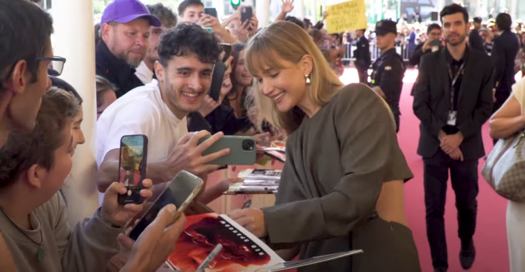Tokom fotokola ranije tog dana, povodom promocije svog komično-trilerskog filma ,,Die My Love", Lorensova je pozirala pred kamerama sa klasičnom frizurom u kojoj joj je kosa bila elegantno podignuta i pričvršćena unazad.