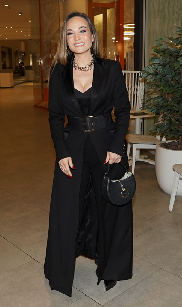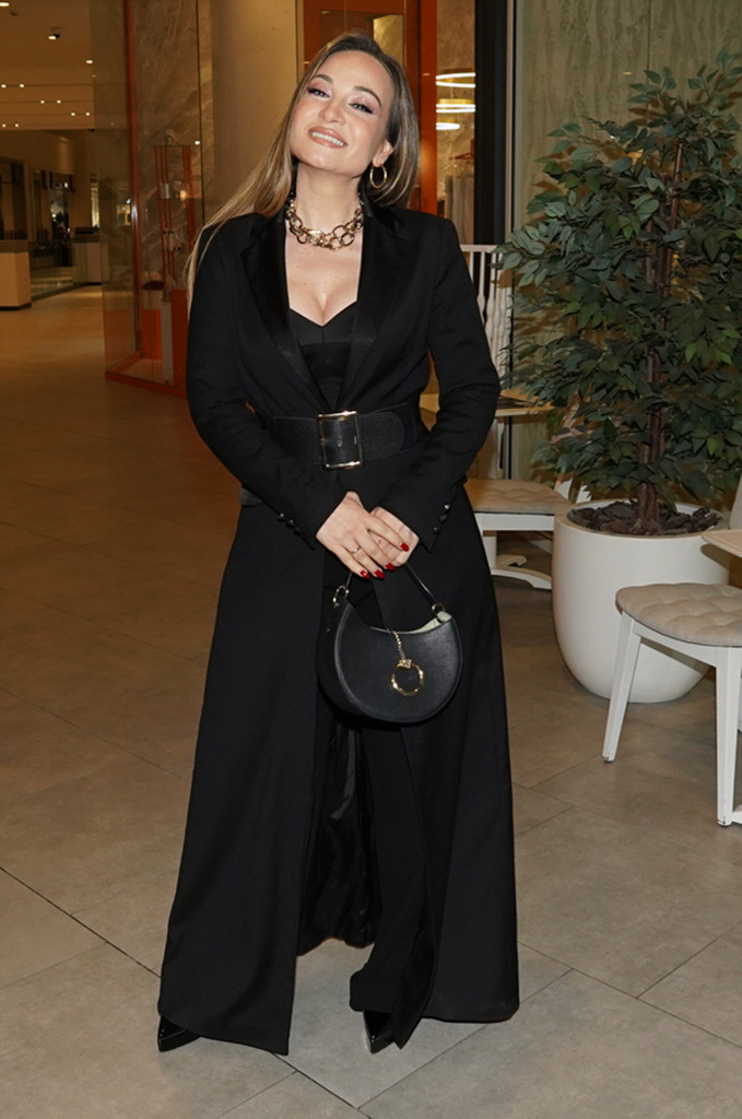 Jelena se odlučila za dugi crni mantil koji je ustručila širokim pojasom, čime je naglasila siluetu i unela dozu sofisticiranosti. Njen izbor masivnog zlatnog lanca i elegantne mini torbice dodatno je pojačao utisak samopouzdanja i stila.