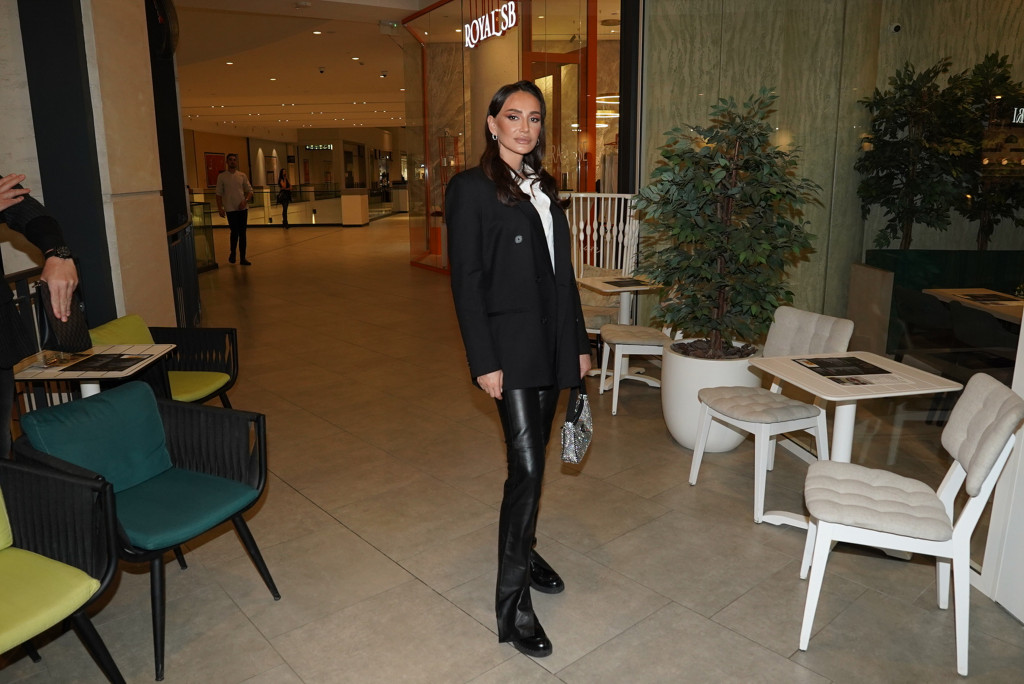 Emina je odabrala predimenzionirani sako, belu košulju i kožne pantalone, stvarajući savršen balans između poslovnog i urbanog stila. Look je upotpunila šljokičavom torbicom i dosta sličnom ogrlicom, čime je unela notu glamura i svežine u klasičnu crno-belu kombinaciju.