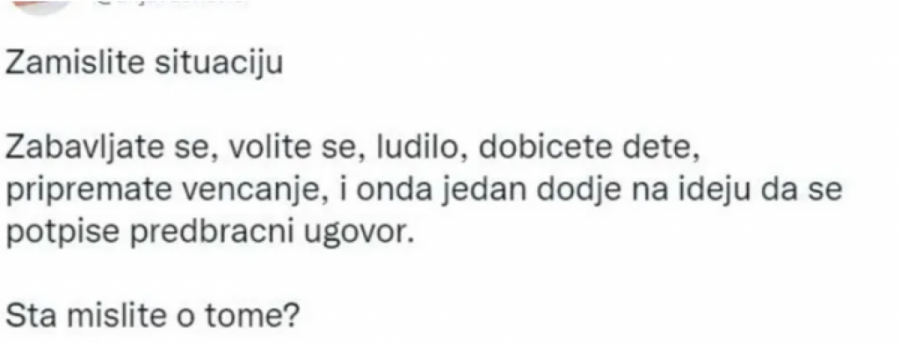 Jedna korisnica Tvitera, Anja, započela je diskusiju o tome, napisavši: „Zamislite situaciju: zabavljate se, volite, imaćete bebu, venčaćete se, a onda neko od mladenaca dolazi na ideju da potpišemo predbračni ugovor. Šta mislite o tome?".