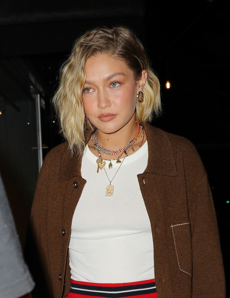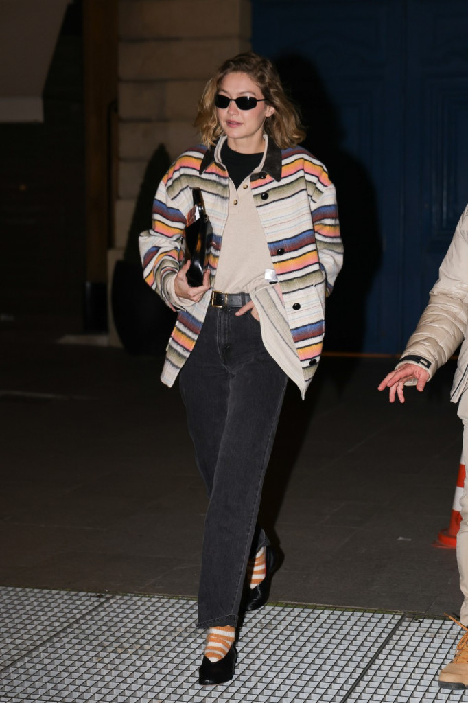 Pored prstena, Hadid je nosila crno-belu kombinaciju: beli top i kožne pantalone sa srednje visokim strukom, uz crne štikle. U ruci je držala belu torbicu i upotpunila izgled zlatnim nakitom.
