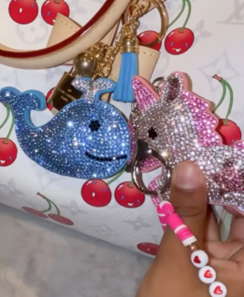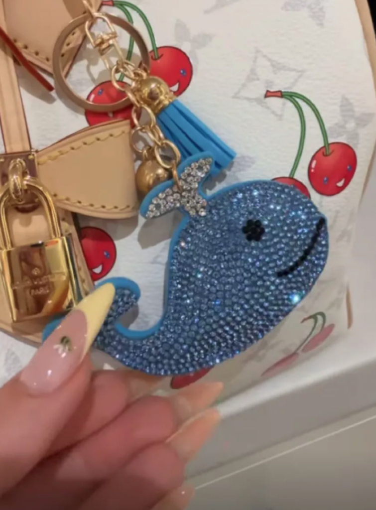 „Tru baš voli priveske i obožava da ukrašava svoj ranac, a očigledno voli i da ukrašava moju torbu, jer sam upravo videla da je na moju torbu stavila ovaj prijesak u obliku kita,“ rekla je Kardašijanka (40), dok je zumirala plavi, ukrašeni privesak kita na svojoj ,,Louis Vuitton" torbi sa temom trešanja.