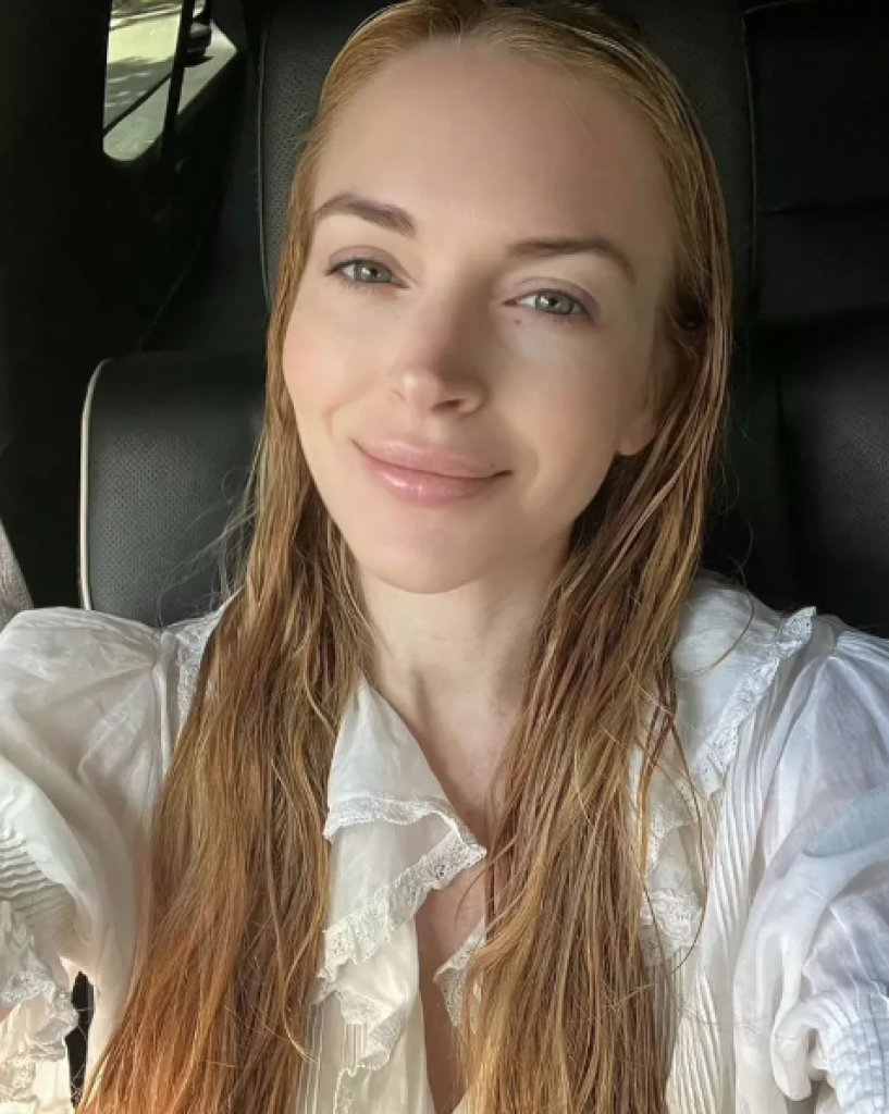 Na slici, Lohan je nosila belu bluzu sa karnerima oko ovratnika i rukavima sa čipkom, a uz to je imala mokru kosu i nežan osmeh. Zvezda izgleda kao da je fotografiju napravila sa prednjeg sedišta automobila.