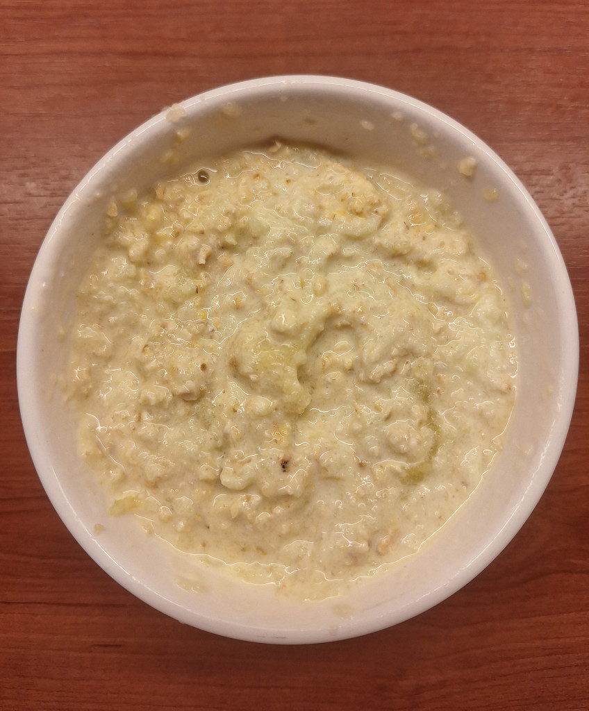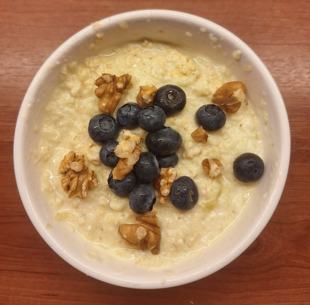 Kaša se sastoji od ovsenih pahuljica, soka od narandže, grčkog jogurta, rendane jabuke, borovnica i oraha. Odmah sam pomislila: ,,Ne volim ovsene pahuljice, ni sok od narandže, a nisam ljubitelj ni jabuka, a još manje oraha. To je poseban nivo mržnje koji ne mogu ni da vam opišem".