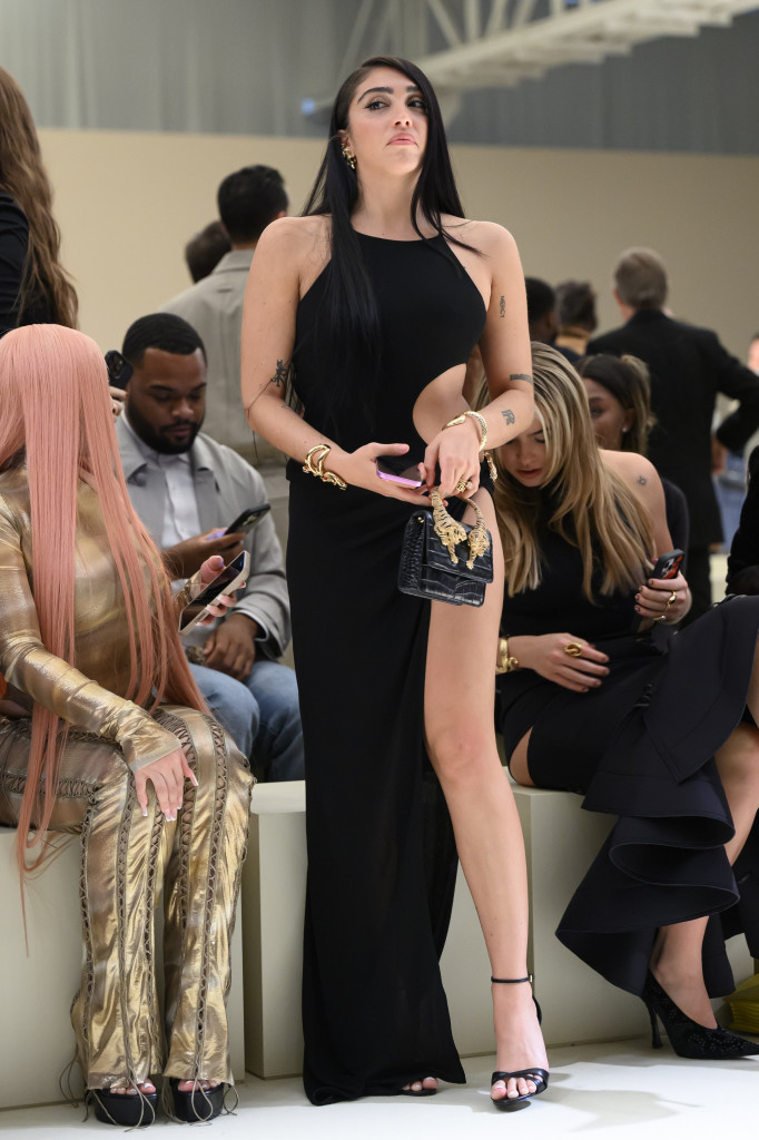 U crnoj haljini s odvažnim izrezima i visokim šlicem na nozi, samouvereno je pozirala pred fotografima i sedela u prvom redu modne revije.