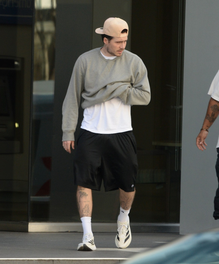 Bruklin je viđen kako je obučen u belu široku majicu, sivi oversized duks, bele sportske čarape, bele patike i bež kačket. Njegov izgled je jednostavan, udoban i potpuno ležeran.