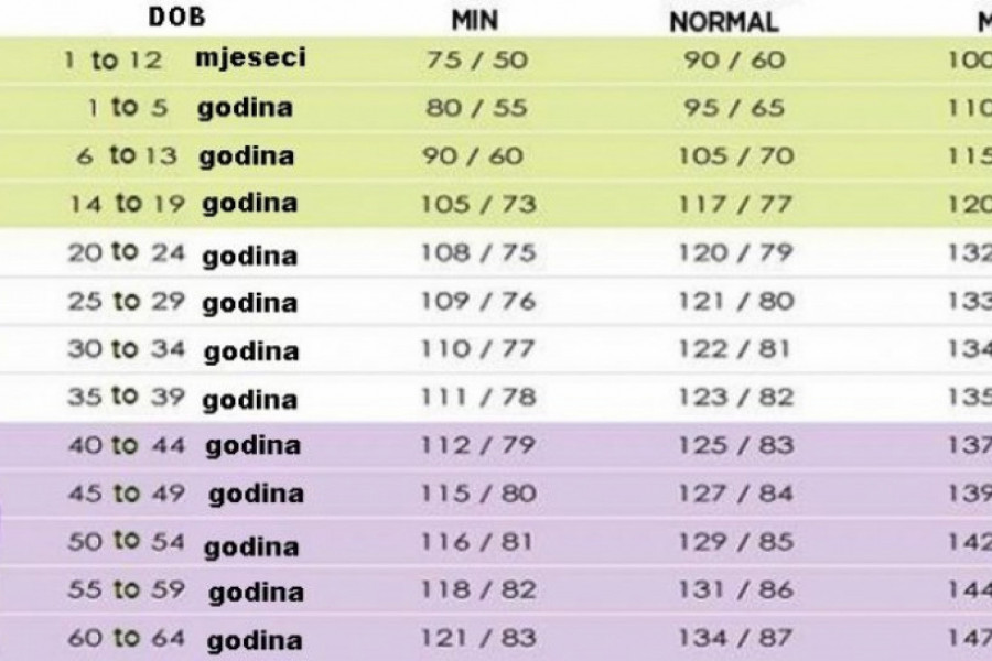 Ipak, to ne mora biti tako, jer vrednost krvnog pritiska je drugačija prema uzrastu. Tako da bi bilo dobro da pogledate ovu tabelu i biće vam mnogo jasnije.